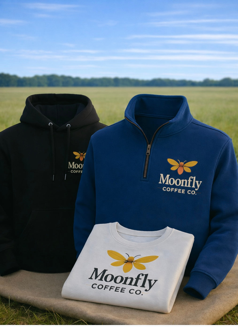 Moonfly collections bring the same spirit to everything we make—coffee, clothing, and the gear that carries them. Our beans and grinds are fresh-roasted and story-numbered, each tied to a moment worth remembering. Pods and instants keep that flavor and purpose close at hand—fast, simple, real. And our apparel and gear extend the story beyond the cup, built for comfort, movement, and the quiet places where light still shows up.