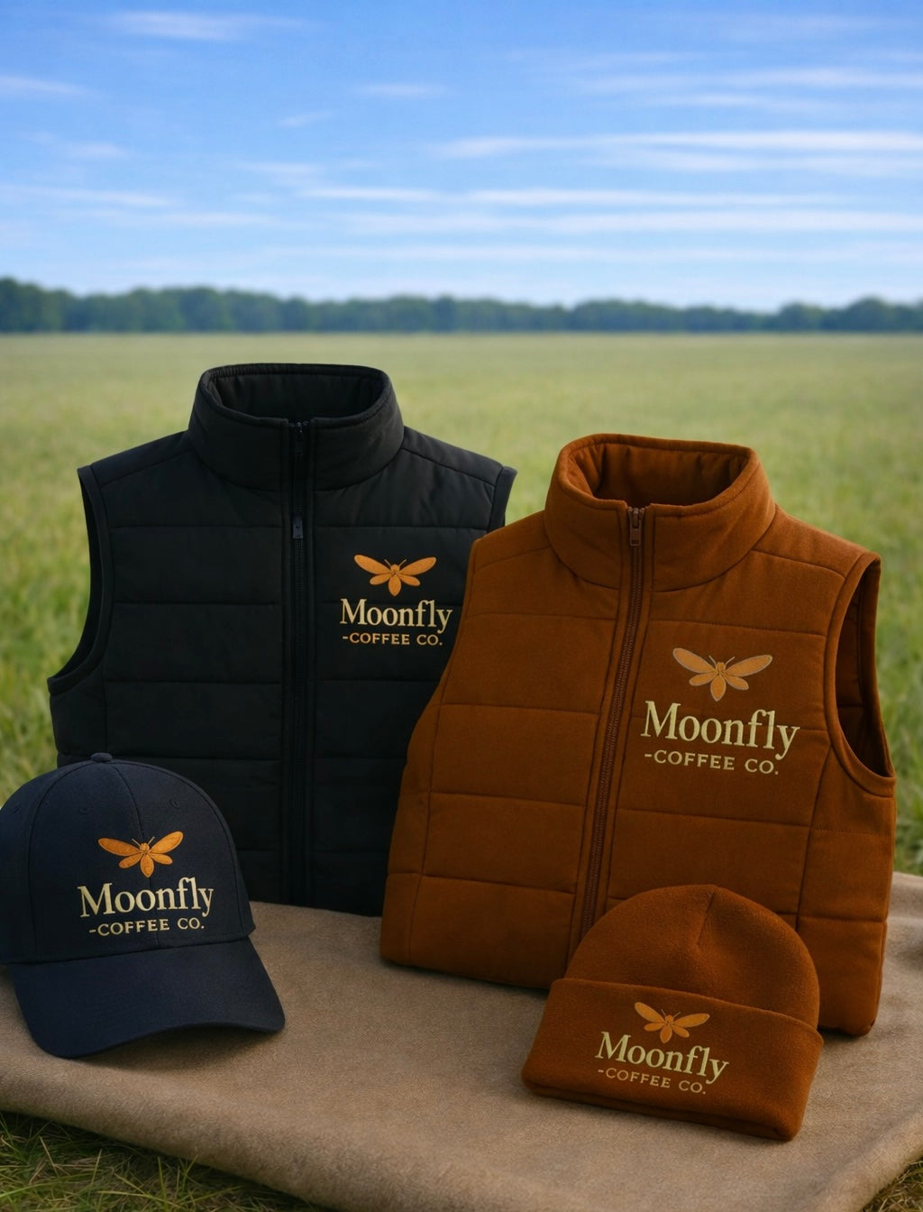 Moonfly collections bring the same spirit to everything we make—coffee, clothing, and the gear that carries them. Our beans and grinds are fresh-roasted and story-numbered, each tied to a moment worth remembering. Pods and instants keep that flavor and purpose close at hand—fast, simple, real. And our apparel and gear extend the story beyond the cup, built for comfort, movement, and the quiet places where light still shows up.